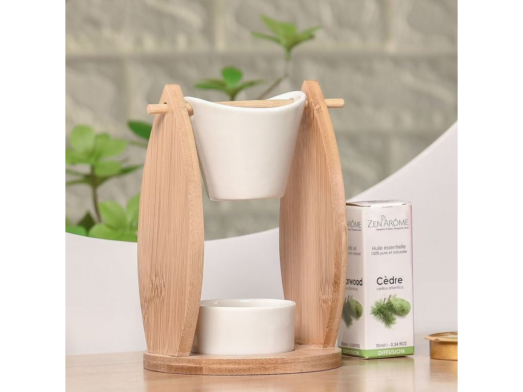 Má drevený stojan s keramickou nádobkou, do ktorého sa zmestia esenciálne oleje, domáce vône alebo vonný vosk. Potom jednoducho umiestnite čajovú sviečku do keramickej nádoby tak, aby teplo aktivovalo difúziu a jemne prevoňalo interiér miestnosti.